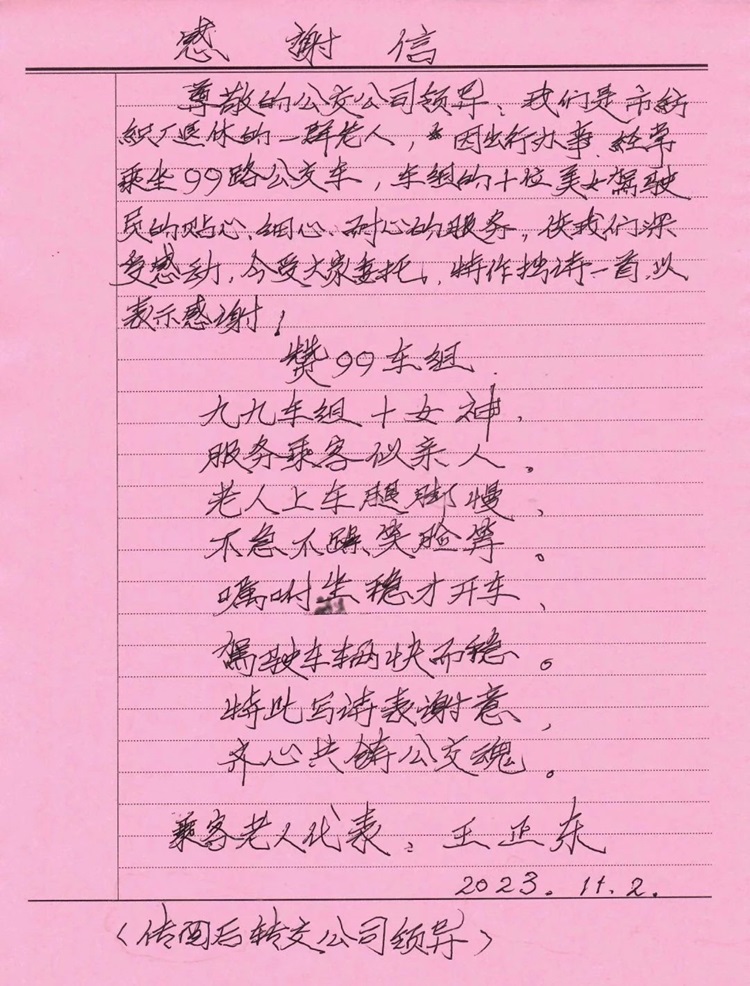 “九九車組十女神,服務(wù)乘客似親人。老人上車腿腳慢,不急不躁笑臉等……”日前,市公交公司收到市紡織廠退休老人王正東寄來(lái)的一封信,信中老人賦詩(shī)一首表達(dá)了對(duì)99路巾幗示范線班組優(yōu)質(zhì)服務(wù)的感謝和夸贊之情。