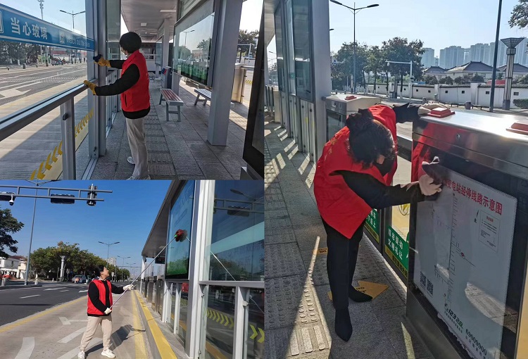 志愿者們來(lái)到開(kāi)放大道,大家兵分兩路,有的用抹布擦拭無(wú)人值守站臺(tái)上的浮塵,開(kāi)展清掃站臺(tái)行動(dòng);有的投身于新墩社區(qū)文明交通宣傳工作中去,征求對(duì)居民群眾對(duì)公交營(yíng)運(yùn)服務(wù)的意見(jiàn)和建議,志愿服務(wù)活動(dòng)如火如荼開(kāi)展。