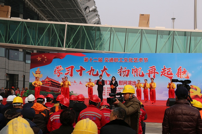 為學(xué)習(xí)宣傳黨的十九大精神,慰問(wèn)奮戰(zhàn)在施工一線的廣大建設(shè)者,1月19日下午,市總工會(huì)、市交通運(yùn)輸局聯(lián)合主辦、鹽城公共交通總公司承辦的“宣傳十九大·送戲進(jìn)工地”主題活動(dòng)在鹽城南洋機(jī)場(chǎng)T2航站樓施工現(xiàn)場(chǎng)順利舉辦。