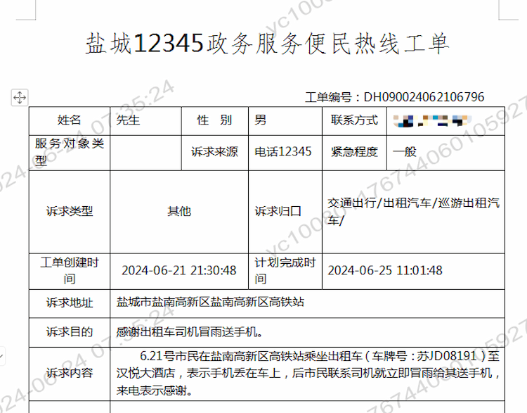 6月25日,公交出租汽車公司收到市交通運輸服務中心轉來的12345政務熱線表揚工單,感謝的哥顧愛斌師傅及時歸還丟失的手機。