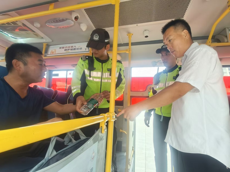 本次演練以實(shí)景模擬形式展開,演練場景設(shè)定為公交車駕駛員運(yùn)營途中遇到一名乘客攜帶行李包上車,在例行開包檢查時(shí),發(fā)現(xiàn)一個(gè)裝有透明液體的礦泉水瓶。駕駛員要求其開瓶檢查時(shí),該乘客情緒激動(dòng),強(qiáng)行進(jìn)入車廂,拒不配合檢查,并將不明液體撒入車廂。