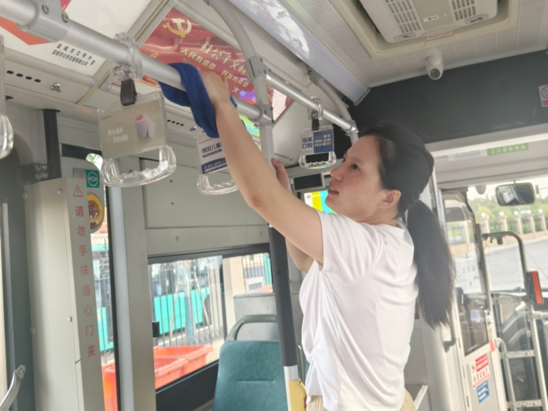 衛(wèi)生清潔行動開始后,打掃人員迅速分組,攜帶清潔工具,登上了一輛輛即將投入運營的公交車。他們分工明確,有的負責車廂內(nèi)部的清掃,從座椅、扶手到地板,每一個角落都不放過;有的則專注于車輛外部的清潔,用高壓水槍沖洗車身,擦去灰塵與污漬,讓公交車煥然一新。