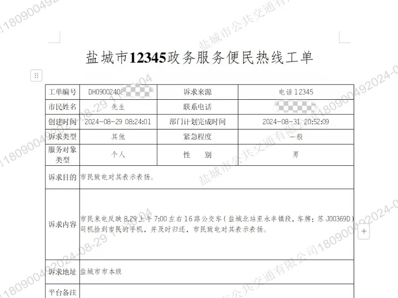 8月29日下午,三分公司收到一份來自“12345”政務(wù)服務(wù)便民熱線的表揚(yáng)工單,市民施先生對16路駕駛員孫洪林撿到手機(jī)、及時歸還的行為提出表揚(yáng)。