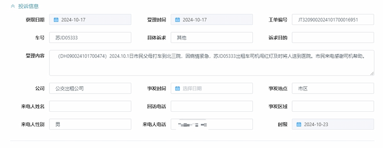 10月18日,出租汽車公司接到12345轉(zhuǎn)來的表揚工單,市民顧先生感謝蘇JD05333公交出租車駕駛員嚴(yán)海峰熱心助人,為了護(hù)送市民父親去醫(yī)院急救,和時間賽跑,連闖2個紅燈。
