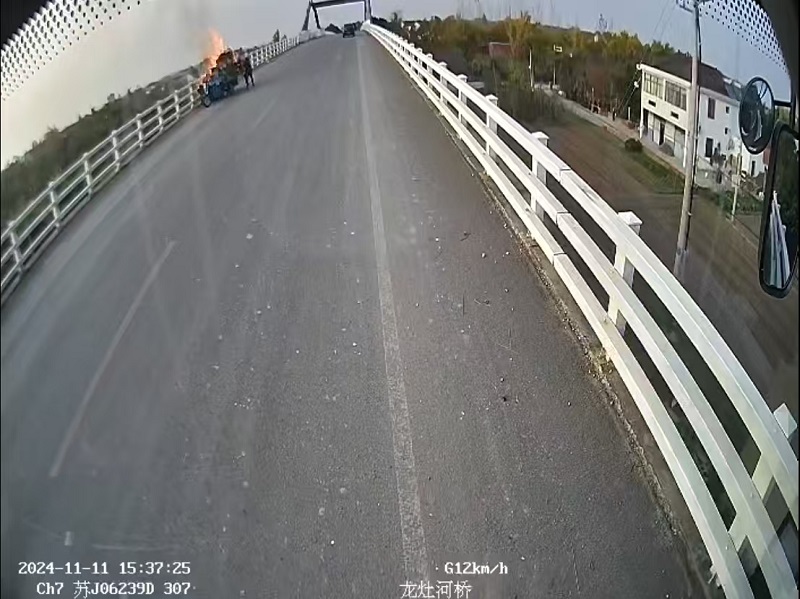 當(dāng)天下午15時37分左右,307路駕駛員張玉春像往常一樣駕車行駛至龍灶河橋附近時,遠遠地看到前方有一輛電動三輪車停在路邊,裝載的紙板起火并迅速蔓延,車主正在徒手奮力撲救。