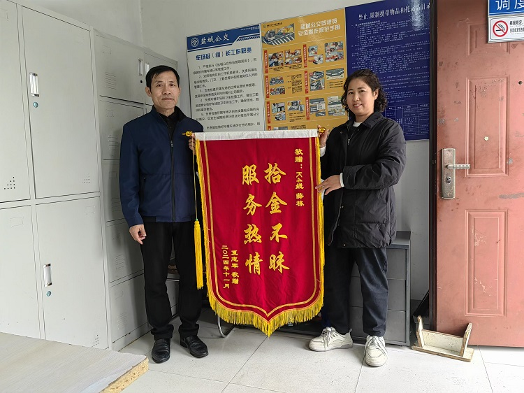 像這樣的暖心故事在鹽城公交不斷涌現(xiàn)。11月15日上午9點40分左右,市民夏先生來到萬達公交停車場,將一面印有“拾金不昧、服務(wù)熱情”的錦旗送到了場站線調(diào)員手中,對K4線駕駛員薛棟的拾金不昧行為表示感謝。