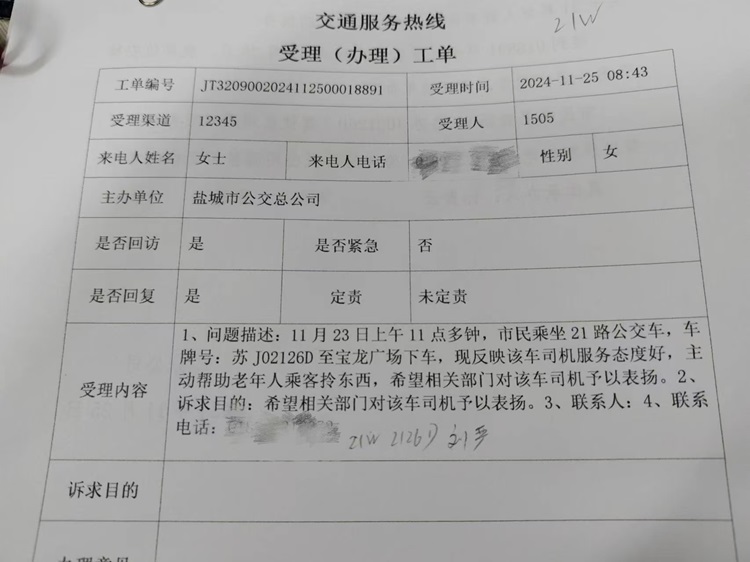 11月25日上午8點(diǎn)43分,市公交二分公司收到一份12345政務(wù)服務(wù)熱線傳來(lái)的表?yè)P(yáng)工單,表?yè)P(yáng)21路車(chē)牌號(hào)為蘇J02126D駕駛員服務(wù)態(tài)度好,主動(dòng)幫助老人拎東西,希望相關(guān)部門(mén)對(duì)該車(chē)司機(jī)予以表?yè)P(yáng)。經(jīng)調(diào)查得知被表?yè)P(yáng)的駕駛員系95后駕駛員劉嚴(yán)。