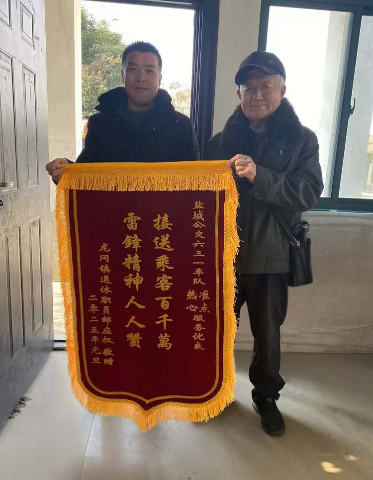 1月22日下午,市民鄒爺爺將一面印有“接送乘客百千萬(wàn),雷鋒精神人人贊”內(nèi)容的錦旗送到了鹽城公交萬(wàn)達(dá)停車場(chǎng),對(duì)631線駕駛員熱情服務(wù)的工作態(tài)度表達(dá)了高度贊揚(yáng)和感謝。