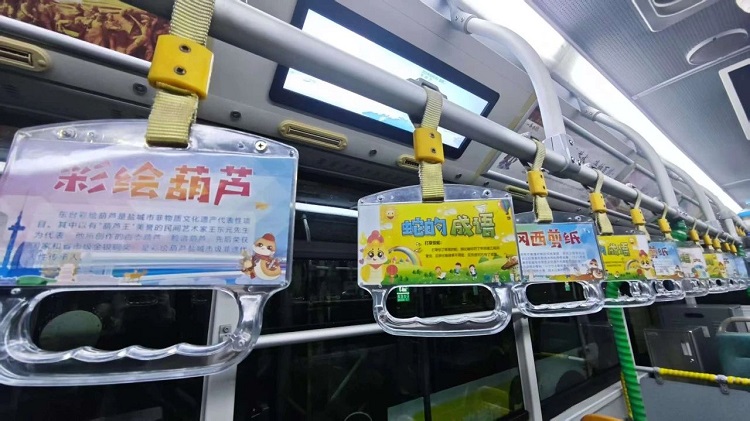 除了安全保障、服務(wù)提升,市公交公司還在校園定制專線上融入了鹽城地方特色文化元素,打造了獨具特色的“非遺文化車廂”。走進(jìn)車廂,映入眼簾的是充滿年味的蛇年主題裝飾,拉手環(huán)上印著“靈蛇獻(xiàn)瑞”、“筆走龍蛇”等寓意好的成語,車輛上方的宣傳欄及車輛擋板上則展示了“曬鹽技藝”“彩繪葫蘆”“岡西剪紙”等鹽城豐富的非物質(zhì)文化遺產(chǎn)及蛇的寓意簡介,讓學(xué)生們在乘車途中,就能感受到濃厚的文化氛圍。