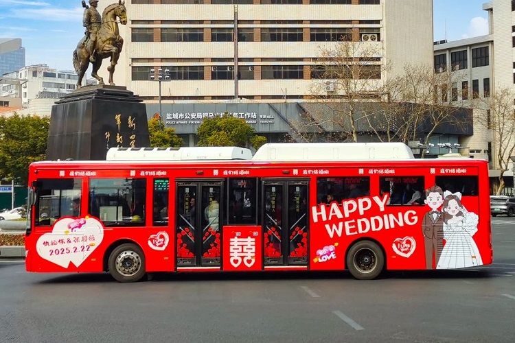 近年來(lái),公交婚車并不少見,全國(guó)各地時(shí)有公交婚車上演,在鹽城也有不少新人選擇了公交婚車。對(duì)于新娘張超薇來(lái)說(shuō),公交婚車有著特殊的意義。“領(lǐng)證的時(shí)候正好看到了公司在民政局開展公交婚車宣傳,覺(jué)得很有意思,當(dāng)時(shí)就想著一定要選擇公交車當(dāng)婚車”。為什么選擇公交車作為婚車?張超薇說(shuō),與傳統(tǒng)車隊(duì)相比,公交車容載量更大,還配有專屬的司機(jī),安全又實(shí)用。而且費(fèi)用也不算高,也更為經(jīng)濟(jì)和環(huán)保。重點(diǎn)是,婚車設(shè)計(jì)使用了超大幅海報(bào),行駛過(guò)程中十分搶鏡,賺足回頭率,“這是普通小汽車做不到的!