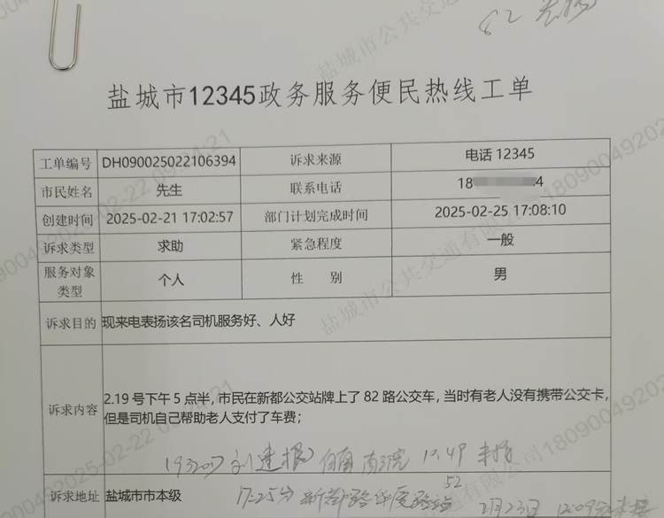 2月21日,二分公司收到12345政務(wù)服務(wù)便民熱線發(fā)來的表揚(yáng)工單,稱贊82路駕駛員劉建根服務(wù)好,暖人心。