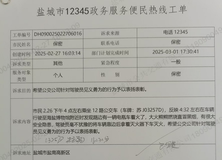 近日,二分公司收到了一件來(lái)自12345市民服務(wù)熱線的表?yè)P(yáng)工單,對(duì)12路駕駛員朱圣勇在遇到電瓶車(chē)著火時(shí)的英勇救火行為表示高度贊揚(yáng)。