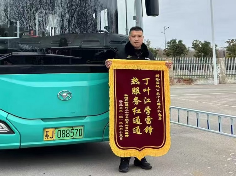 有一次,丁葉江駕駛車輛?抠e達嘉園站臺時,一位奶奶焦急地告訴他,在乘坐K8線時不小心將手提包遺留在車廂內(nèi),請求丁葉江幫忙尋找。丁葉江聞言立即聯(lián)系后臺工作人員尋找,不久后,工作人員來電告知手提包已找到,請丁葉江轉告奶奶前往萬達公交停車場領取。丁葉江這種熱情助人的行為給車廂內(nèi)的乘客鄒爺爺留下了深刻印象,他表示,這樣的服務態(tài)度讓他感到非常溫暖,他在丁葉江身上看到了雷鋒精神的體現(xiàn)。因此,特意制作了一面錦旗表示贊揚。
