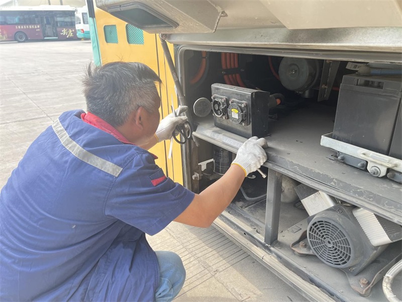檢查中,重點(diǎn)對散熱器、風(fēng)扇、冷凝器、高壓電池艙散熱系統(tǒng)進(jìn)行全面清理,清除積灰與柳絮,檢查工作狀態(tài),確保散熱效率,降低高溫引發(fā)的安全隱患;檢修線路磨損、油液滲漏等,加固老化線束防護(hù)措施,杜絕“跑冒滴漏”現(xiàn)象;對車載空調(diào)進(jìn)行全面檢修,確保在夏季來臨前全部制冷有效;繼續(xù)常態(tài)化檢查轉(zhuǎn)向機(jī)構(gòu)與制動系統(tǒng)等部件,確保安全行車。
