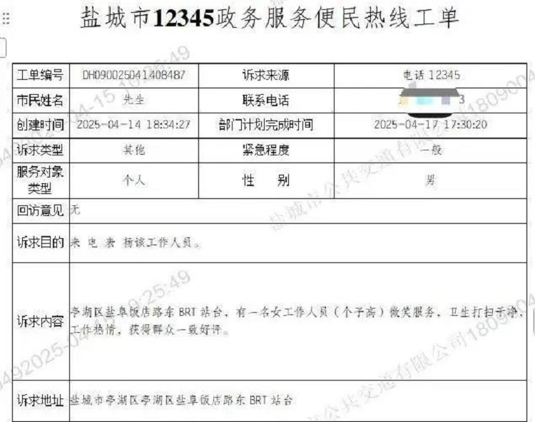 4月14日晚,亭湖區(qū)鹽阜飯店東BRT站務員征明收到了一則市民表揚工單,工單中寫道:“站臺衛(wèi)生干凈整潔,工作人員熱情周到”。作為站臺“管家”,征明每天提前到崗,擦拭座椅、清掃死角,為老年乘客搬運行李;面對問詢,她總是不厭其煩地解答,用真誠的微笑化解乘客的焦慮。十年如一日的堅守,讓這座站臺成了市民心中的“暖心驛站”。