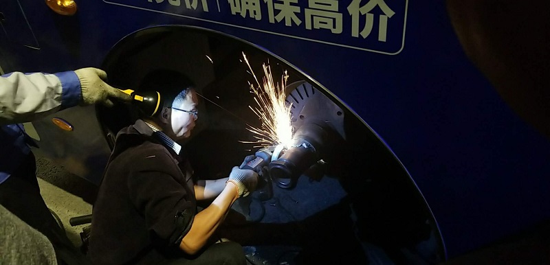 修理人員將半軸取下后發(fā)現(xiàn)軸頭軸承已燒死,無(wú)法取下,只能進(jìn)行熱切割處理。因后輪內(nèi)軸承嚴(yán)重?zé)吃诤髽虬胼S導(dǎo)管處,若采取常規(guī)氧氣熱切割的方式極易損壞后橋。下午6點(diǎn)多,修理公司管理人員和修理精英全部到達(dá)現(xiàn)場(chǎng),經(jīng)過(guò)一番討論,最后決定:克服一切困難,采用最費(fèi)時(shí)費(fèi)力的手動(dòng)打磨方式,用電動(dòng)切割機(jī)進(jìn)行打磨切割,最大程度降低維修成本。