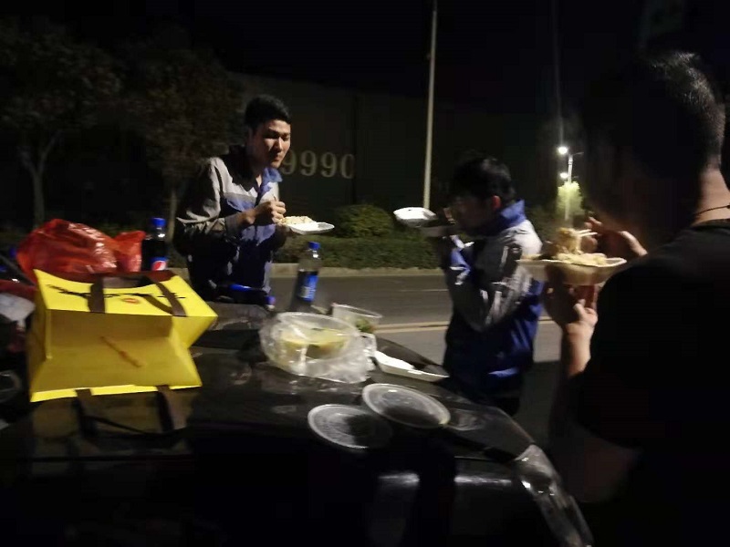 完成這一切,已經(jīng)是凌晨4點(diǎn)。十月的凌晨有點(diǎn)冷,但是修理工人們卻沒(méi)有感到一絲寒意,甚至忙得汗流浹背。在長(zhǎng)達(dá)16小時(shí)修理后,工人們已是饑腸轆轆,他們沒(méi)來(lái)得及清洗,直接圍坐在皮卡車(chē)前,吃上剛點(diǎn)的外賣(mài)。