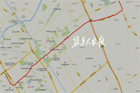 該條線路全長24.5公里,走向為:市公交中心回車場、西環(huán)路、世紀大道、226省道、環(huán)保科技城公交樞紐。沿途停靠:市公交中心回車場、西城逸品、鹽都檢測中心、西環(huán)路鹿鳴路口、金大洋、金太陽豐盛裝飾城(下行)、豐盛金太陽裝飾城(上行)、紅星美凱龍、大世界裝飾城、鳳凰文化廣場、高力國際家居港、市行政中心、金融城、世紀大道興業(yè)路口、城東水廠(上行)、世紀大道新園路口、世紀大道天山路口(下行)、鹽城師范學院、世紀大道希望大道口、世紀大道泰山路口、世紀大道黃山路口、世紀大道東環(huán)路口(上行)、市婦幼保健院東院(北門)、世紀大道華山路口(下行)、世紀大道五臺山路口、世紀大道東山路口(上行)、世紀大道峨眉山路口、世紀大道嶗山路口、世紀大道九華山路口(上行)、世紀大道沈海高速(西)、世紀大道鳳翔路口、世紀大道民聯(lián)五組、世紀大道民聯(lián)六組、世紀大道民聯(lián)九組、世紀大道226省道口、環(huán)保科技城公交樞紐。