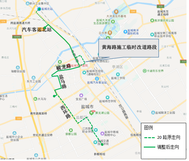 20路走向:汽車客運北站(北)、開放大道、黃海路、文港路、毓龍路、建軍西路、鹽馬路、大慶西路、西環(huán)路、萬達公交回車場。