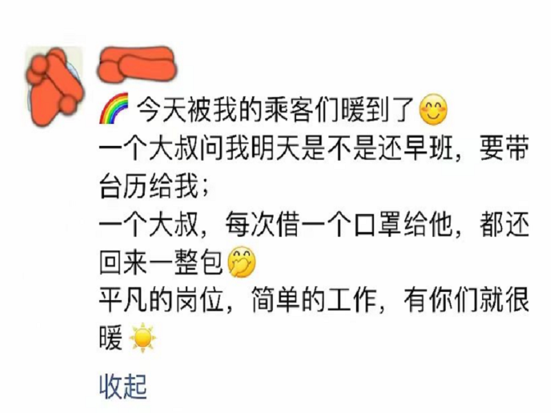 除了十米車(chē)廂,公交站臺(tái)上每天都有溫馨的小事發(fā)生。悅達(dá)集團(tuán)總部站務(wù)員劉富霞撿到小朋友的玩具車(chē),妥善保管多日后再遇小朋友時(shí)歸還,孩子拿回失而復(fù)得的玩具車(chē)時(shí)的燦爛笑容令人難忘。
