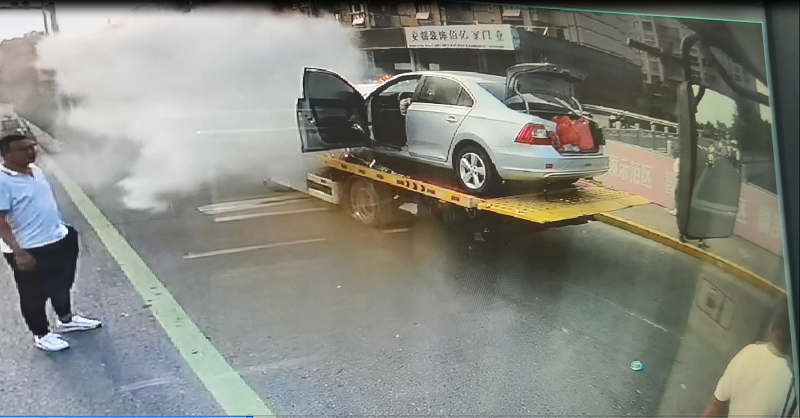 10月1日16時(shí)15分,K4線駕駛員姚廣峰正在執(zhí)行大岡開往鹽城方向的運(yùn)營(yíng)任務(wù),當(dāng)車輛行駛至寶聯(lián)大廈附近時(shí),發(fā)現(xiàn)前方不遠(yuǎn)處一輛清障車拖運(yùn)的小轎車正在起火,一位市民正著急的朝公交車跑來(lái),并揮手示意求助。