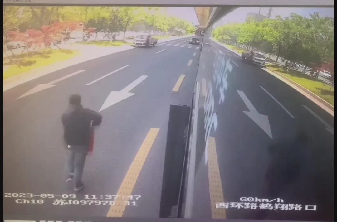 監(jiān)控顯示,5月9日上午11時(shí)36分左右,31路線駕駛員金浦駕駛蘇J09797D行駛到西環(huán)路鶴翔路口附近時(shí),發(fā)現(xiàn)一輛行駛中的小貨車車后廂的貨物燃起熊熊大火。發(fā)現(xiàn)著火后,車主立即停車設(shè)法撲救。
