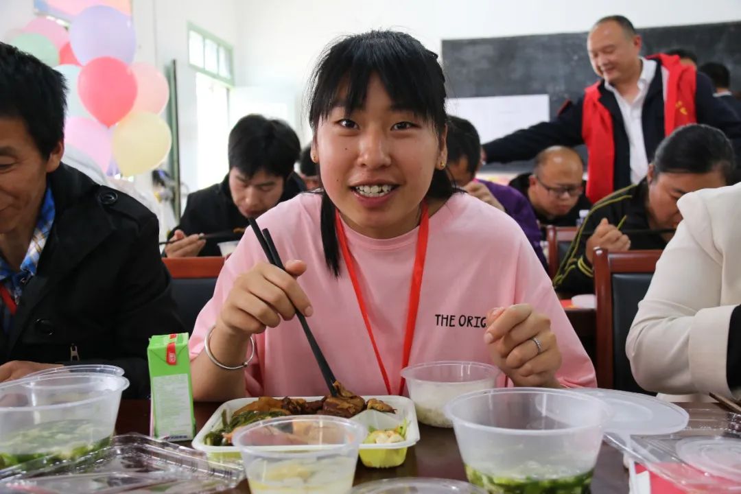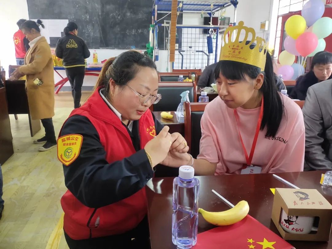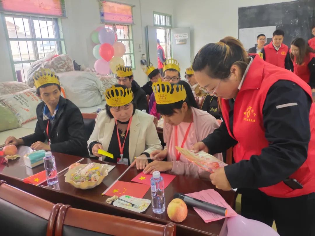 活動(dòng)中,志愿者們?yōu)闅埣踩巳后w送上了糧、油等慰問品,為他們修剪指甲、測(cè)量血壓、心理輔導(dǎo),表演歌、舞、詩(shī)朗誦、講故事等節(jié)目,開展了手工做國(guó)旗、丟沙包、套圈贏禮品等趣味游戲,并準(zhǔn)備了一頓豐盛的愛心午餐和“生日蛋糕”,為殘疾人送上了豐富的“精神食糧”和視聽盛宴。
