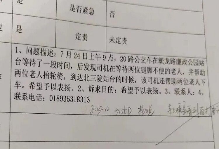 近日,市公交公司收到市長熱線轉來一個工單,希望對一位20路駕駛員熱心幫助兩位腿腳不便老人上下車的行為進行表揚。