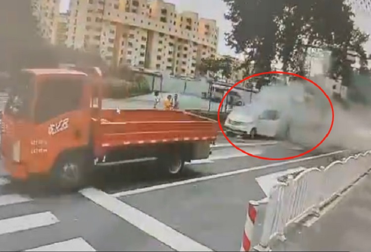 路口轎車失火,公交駕駛員秒變“消防員”滅火