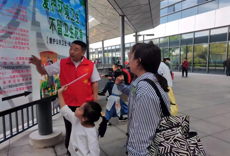 當天一大早,身穿紅色馬甲的志愿者們來到了人頭攢動高鐵站西廣場,向往來的旅客宣傳黨的二十大精神和新時代十年的經(jīng)濟成就,F(xiàn)場輪番播放《歌唱祖國》等歌頌祖國的愛國主義歌曲,吸引了許多乘客駐步聆聽,不少人不由自主地跟著哼唱起來,大家的民族自豪感油然而生。紅色馬甲與國旗交相呼應,為節(jié)日里的高鐵站增添了一抹喜慶氛圍。